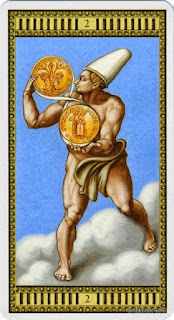 O dois de ouros, procura equilíbrio dentro da dualidade. Se anda na corda bamba, cuidado para não se deixar cair de vez. Poderá haver incapacidade para fazer mais que uma tarefa em simultâneo. Tente manter o seu equilíbrio em todas as áreas, inclusivamente na sua energia física e espiritual.